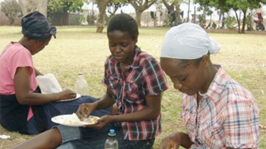 Young Zimbabwean women eat a meal provided by UNHCR in Mutsina while waiting to apply for asylum.