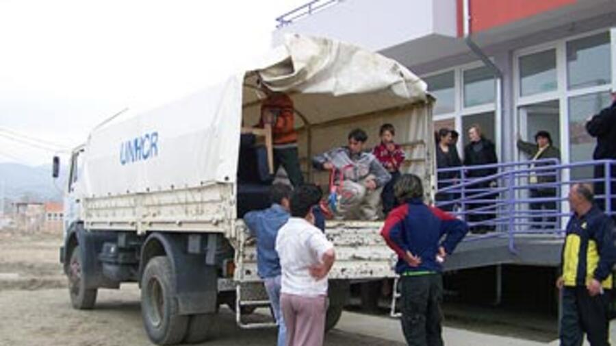Members of the Roma, Ashkalia and Egyptian communities offload belongings from a UNHCR truck in front of the new apartment blocks in Mitrovica where they will live.