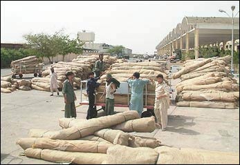 Chad-bound tents being loaded at the airport in Karachi, Pakistan.
