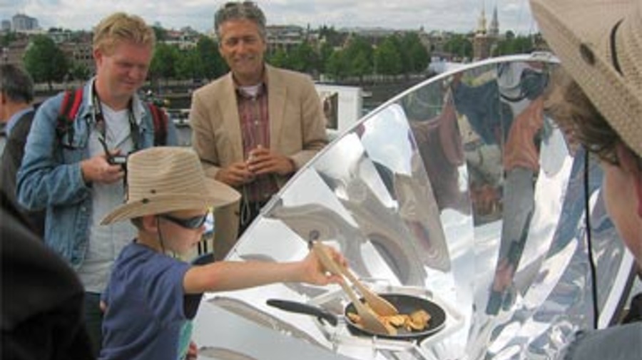 Sunburn. A schoolboy learns how to cook a traditional Dutch pancake on a solar cooker.