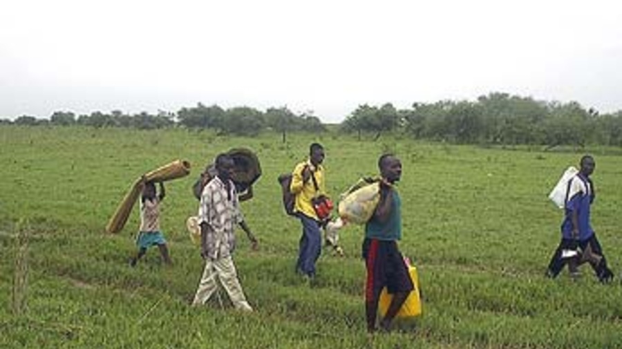 Congolese refugees crossing Burundi's Rusizi National Park after an arduous trek from their homeland in December 2002.