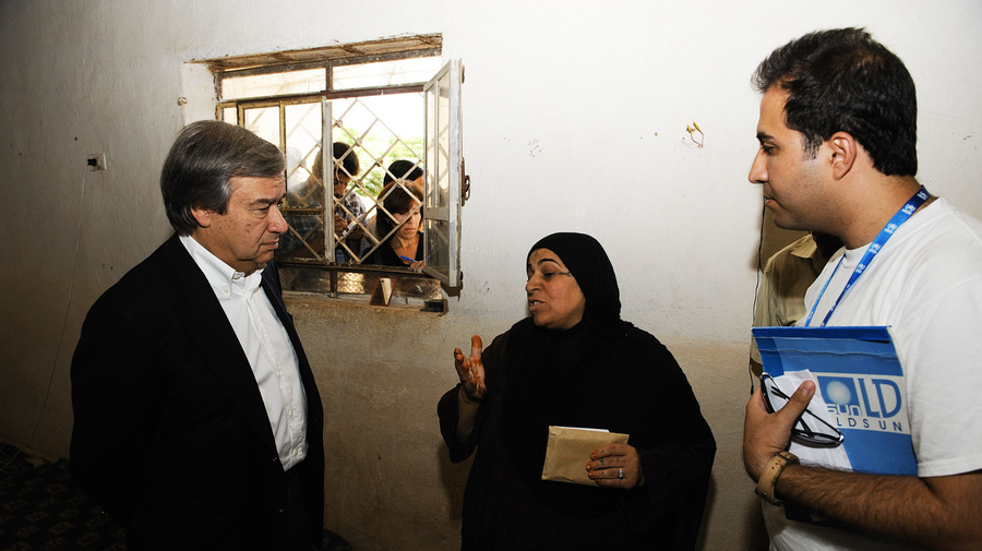 High Commissioner António Guterres talks to an Iraqi refugee in Al Hassakeh before taking part in the live event.