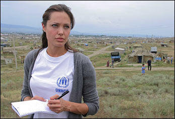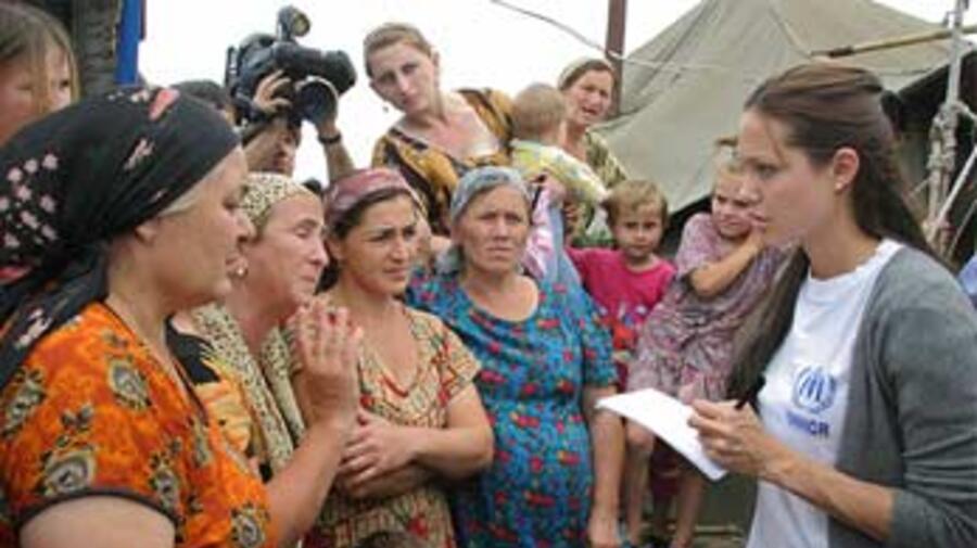 UNHCR Goodwill Ambassador Angelina Jolie with displaced Chechens in Bella camp, Ingushetia.