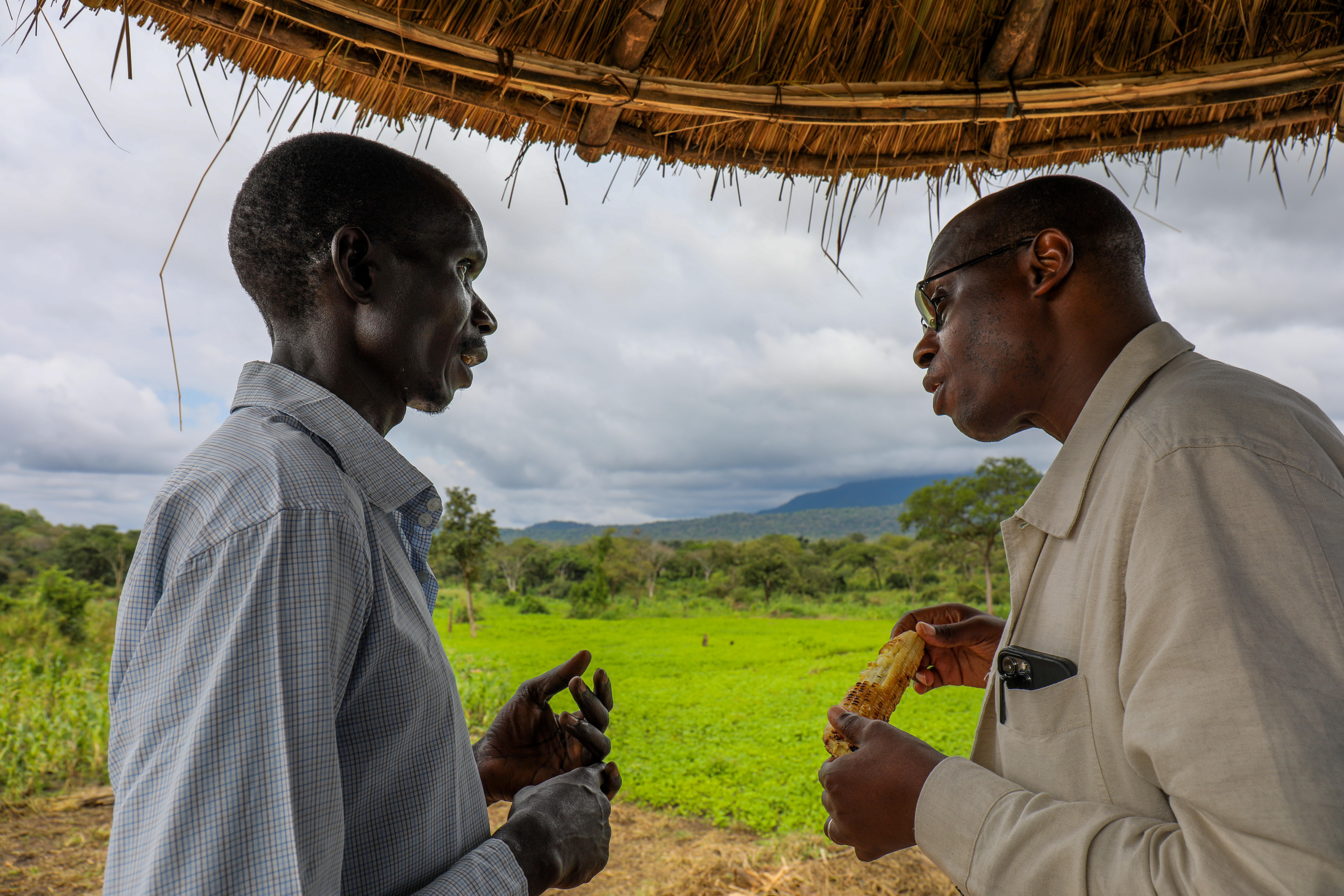 Raouf Mazou, meets with members of the Can – Coya farming collective in Magwi county, Eastern Equatoria State. At the Can – Coya farm, returned refugees work alongside local residents to turn a 250-acre piece of bushy woodland into a working farm producing enough to meet their needs and supply local food demands.