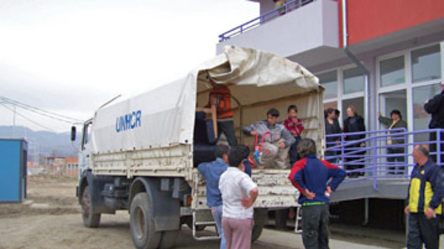 Returnees arrive at the new housing in Mitrovica's Roma Mahala area.