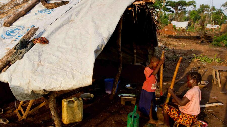 A woman and her son pound food for their dinner at a site near Dungu. They fled Lord's Resistance Army (LRA) attacks.