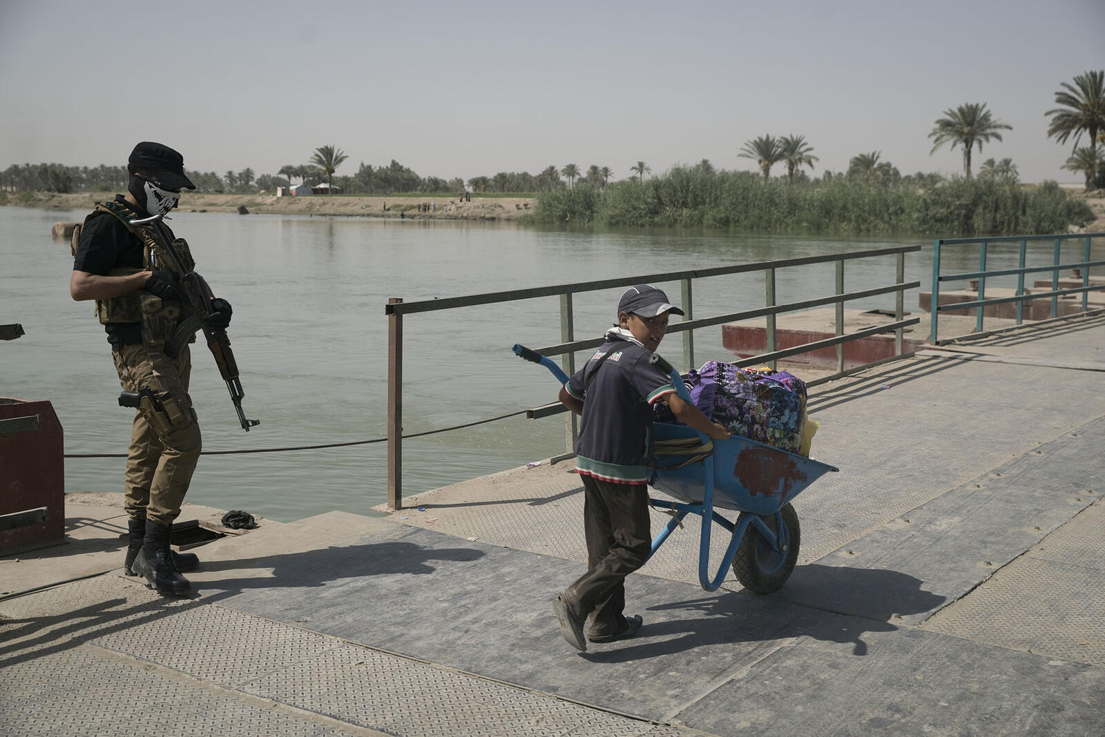 Steady streams of traffic flow in both directions across the floating bridge that spans the Euphrates River near Bzeibiz, Iraq. Young men pushing wheelbarrows full of watermelons, cucumbers and tomatoes weave in and out of families lugging oversized suitcases.