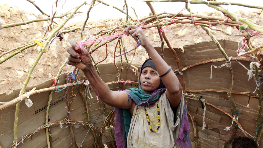 Grandmother Nuuriya constructs a new home from cardboard, branches and string in Galkayo.