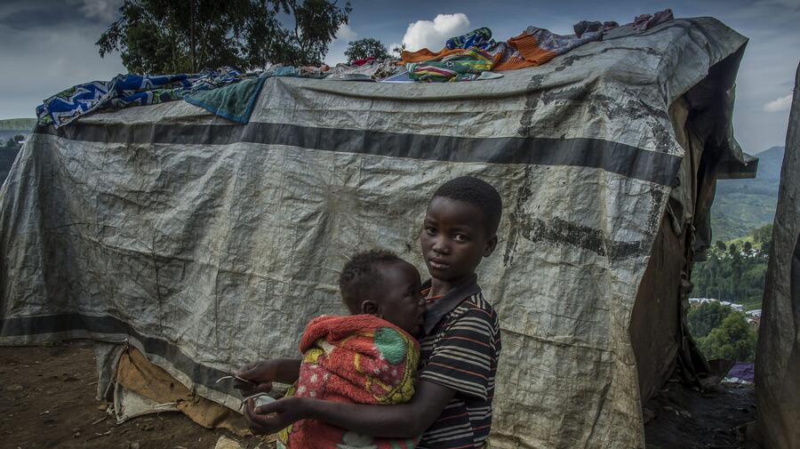 An internally displaced Congolese girl peels vegetables while taking care of her sister in Northern Kivu, DRC.