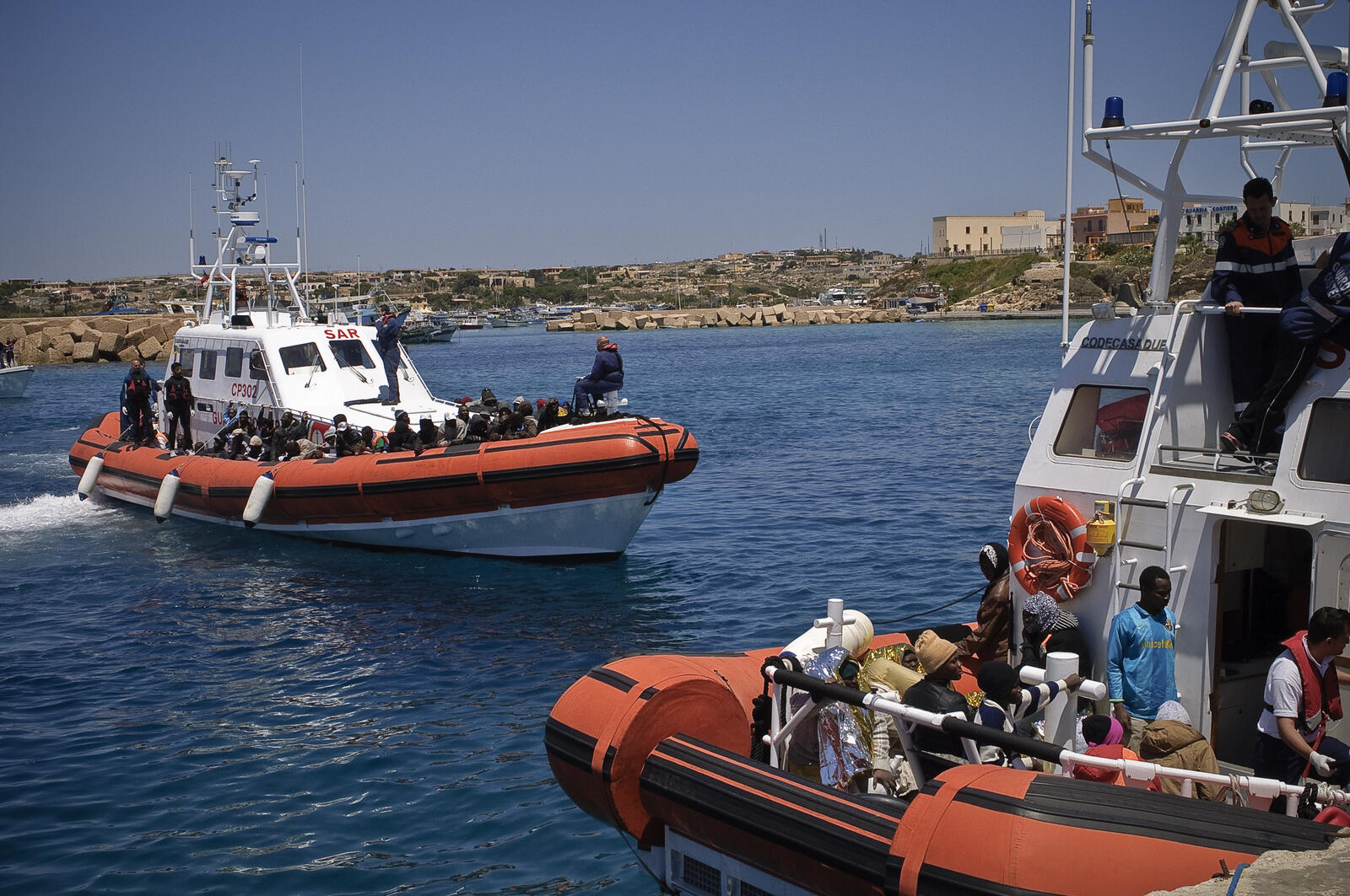 An Italian coastguard vessel prepares to dock in Lampedusa's port. It was carrying 142 people who had sailed from Tripoli, including 30 women and three children. They were rescued before their boat sank at sea.