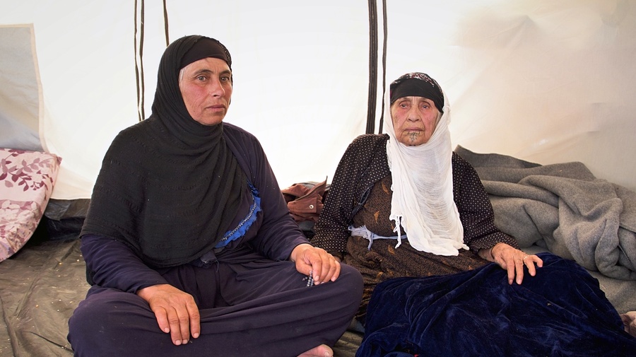 Fatima Mehamed, right, and her daughter Fathiya, left, sit in the family's tent at Qaymawa Camp in the Kurdistan Region of Iraq.