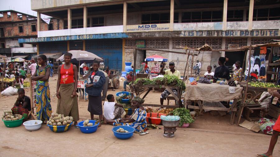 Traders wait for customers on a busy urban street in the Democratic Republic of Congo. Some refugees find it difficult living in the city.