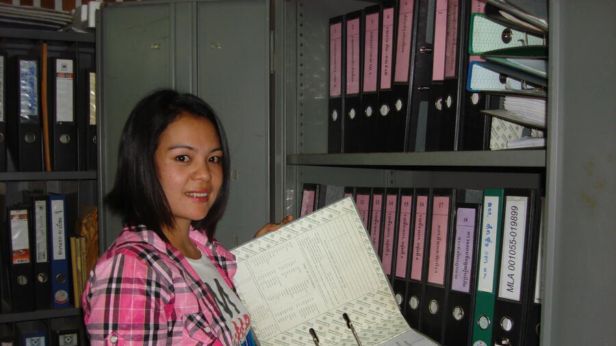 Ah Ywa Paw practises filing in one of the offices in the refugee camp.