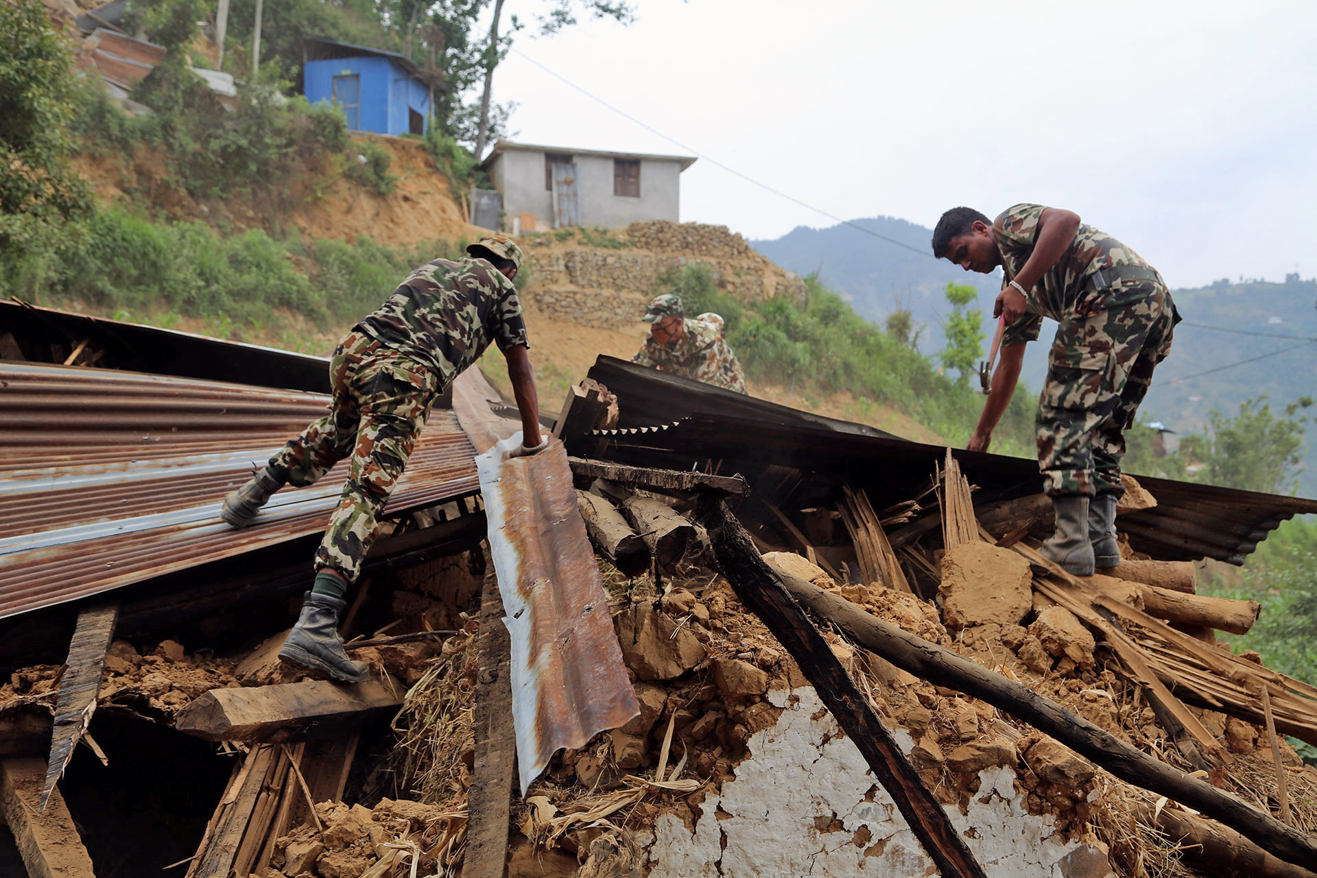 Quartermaster Sergeant Besh Bahadur Budhatoki, a 14-year veteran of the Nepali army, is the commanding officer of the soldiers providing security for a handful of villages including Jhankridanda, about three hours' drive south of Kathmandu in the steep and rugged Himalayan foothills. He comes from Dholaka District, east of Kathmandu, which was hit hard by the first earthquake and then further shaken by the 7.3 magnitude aftershock on 12 May. He has not been home since early April. After the earthquake, his wife called to tell him that his house had been destroyed and that 16 family members were now homeless. He does not know when he will be allowed to leave his post and go help his family rebuild. From the very first day, the Nepali army and police have been at the forefront of relief operations, especially in the villages. Some units have been helicoptered into remote areas; others are deployed to clear roads buried by landslides, often with just shovels and their bare hands. In Jhankridanda, Sgt. Budhatoki's men were working with long bamboo poles to bring down the remnants of a house's walls. They also used thin rope to yank down wooden roof rafters. As the house collapsed in chunks, they were enveloped in clouds of dust and dirt. They carried salvaged sheets of corrugated iron roofing and piled them up neatly near a group of women and children whose house this had once been. Sgt. Budhatoki asked not to be photographed.
