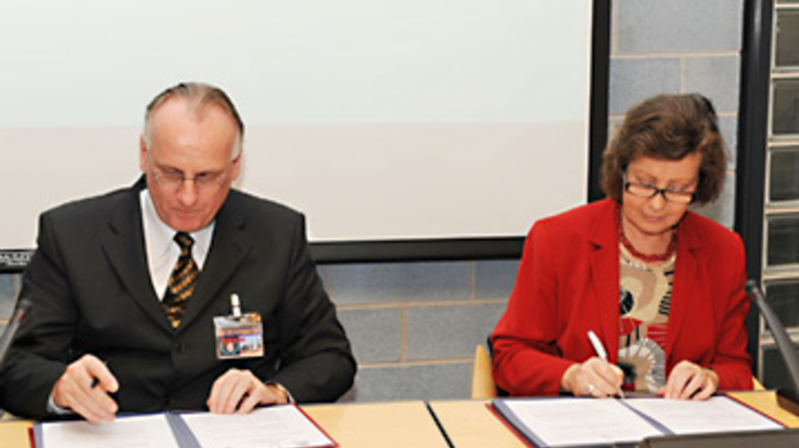 Peter Veld, general director of the Netherlands' Immigration and Naturalization Service, and UNHCR Assistant High Commissioner for Protection Erika Feller sign the Refworld MoU.