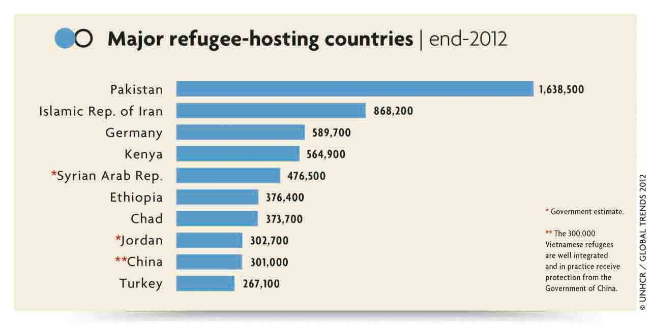 Last year saw little change from 2011 in the rankings of the world's major refugee hosting countries. Pakistan continued to host more refugees than any other nation (1.6 million), followed by Iran (868,200) and Germany (589,700).