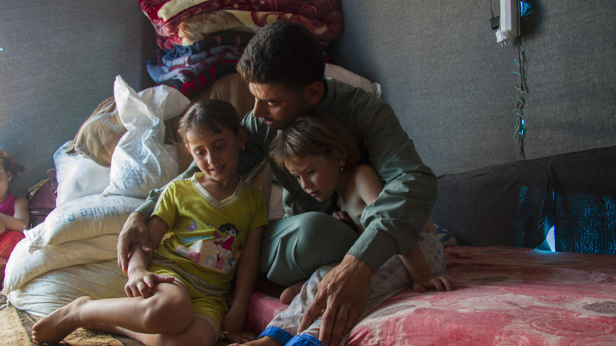 Imad, aged 28, with two of his children in the Arbat site in Sulaymaniyah province. They fled from Ramadi in Anbar province, where relatives are trapped, including eight-year-old Zaynib and her grandparents. "it's hardest for my daughters," Imad said, "they miss their older sister."