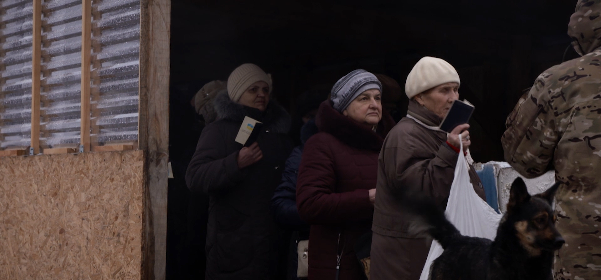 At Novotroitske checkpoint, where civilians cross into government-controlled territory, a group of elderly women are shivering in the snow. They are hoping to collect their pensions.