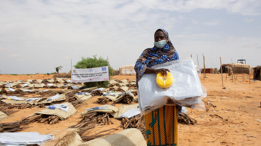Thirty-five-year-old internally displaced Nigerien and mother of four, Aissa Modi, stands beside a firewood distribution at a site in Zarmaganda, Ouallam, with a shelter kit distributed by UNHCR. Three months ago she fled N'zouett village near the Malian border in search of safety.