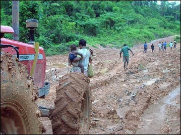 Refugees navigate the almost impassable road between Kiunga and East Awin.