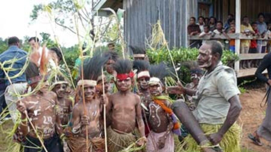 Young Papuan refugees greet visitors to the East Awin refugee settlement in Western Province.