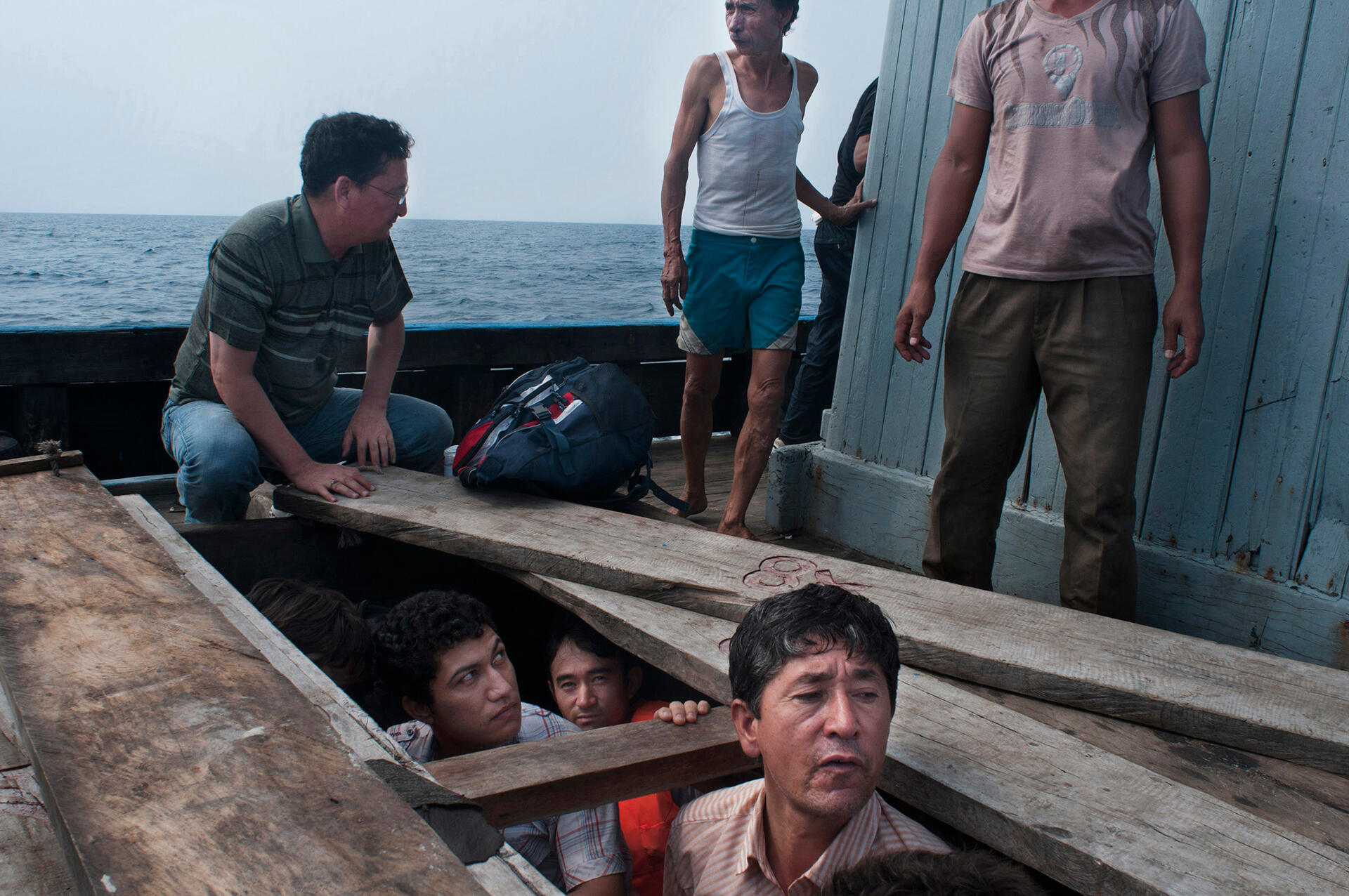 On the first day at sea, Batoor hid below deck with 92 other passengers so as not to be seen by the water police. They took turns coming up for fresh air.