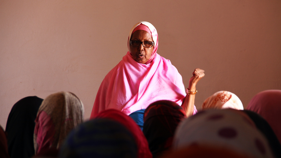 Mama Hawa, winner of the 2012 Nansen Refugee Award, speaks to a group of internally displaced women at the Halabokhad settlement in Galkayo, Somalia. She believes that “illiteracy in women is the reason why they can't demand their rights.”