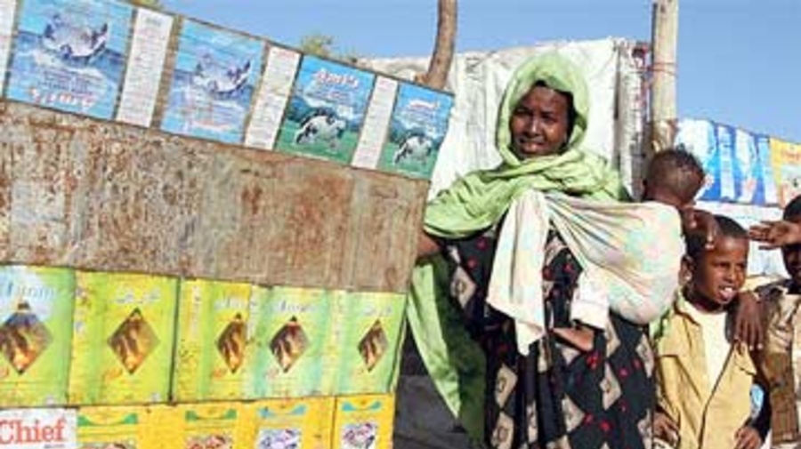 A woman and her family outside the gate to their squatter compound at State House in Hargeisa. The fence is made of flattened tin cans, as are many of the homes impoverished returnees live in.