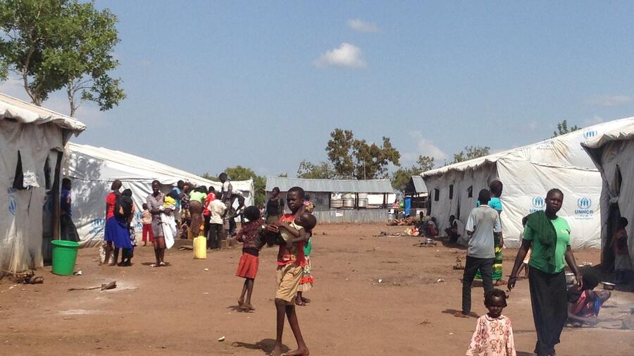 Newly-arrived refugees from South Sudan are given information about services they can access at the reception centre in Bidibidi Settlement, Uganda.