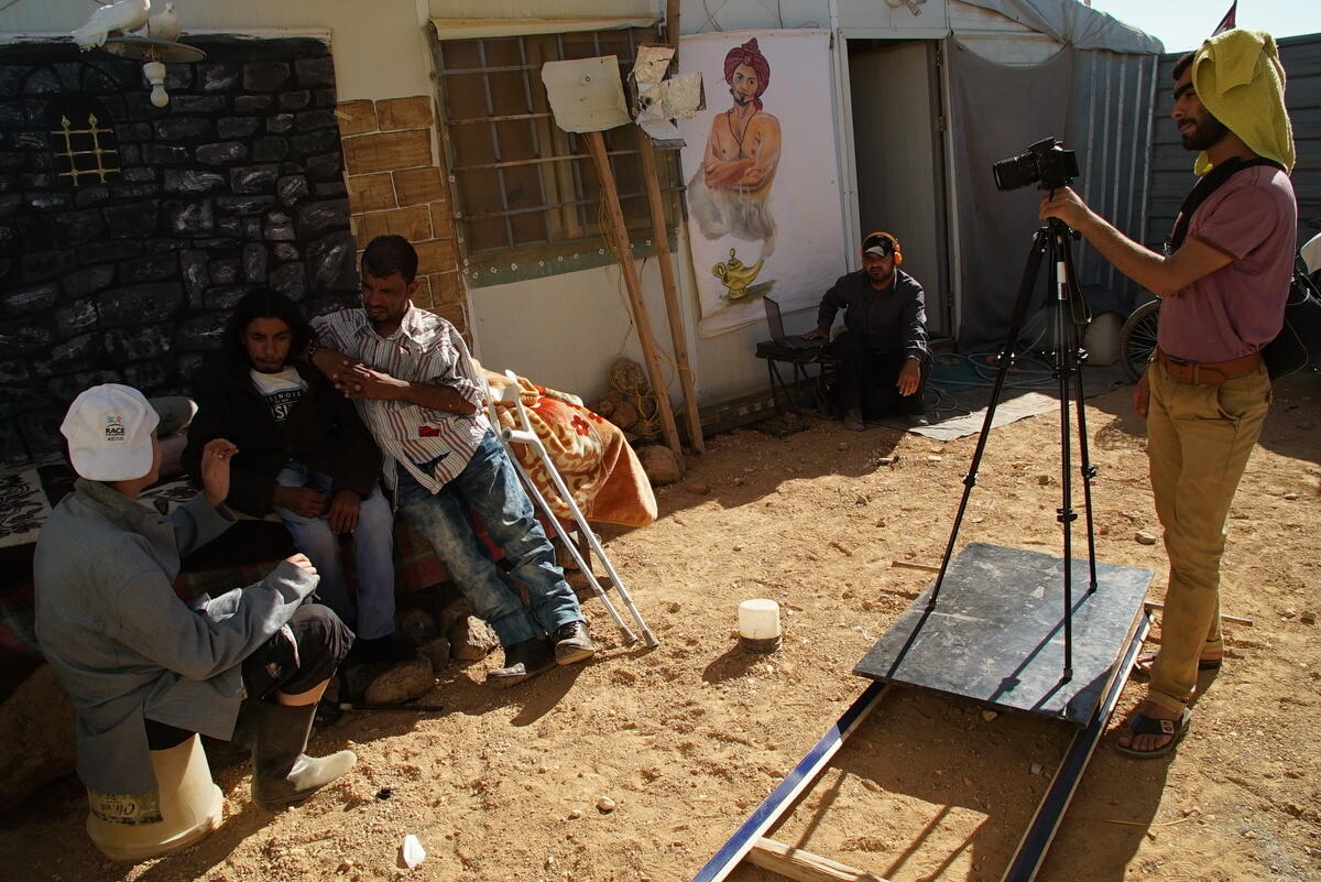 Amid the familiar bustle of daily life in Jordan’s Za’atari refugee camp, something out of the ordinary is taking place in a dusty yard outside one of the many thousands of shelters. A dozen or so refugees are busy erecting sets, setting up lights and cameras, and donning makeup and costumes.