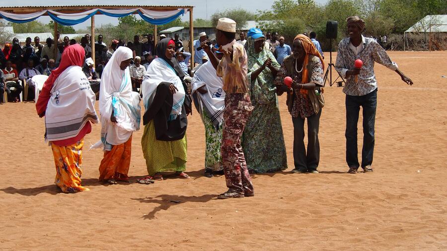Refugees take part in the opening ceremony for the new Kenyatta University campus in Dadaab.