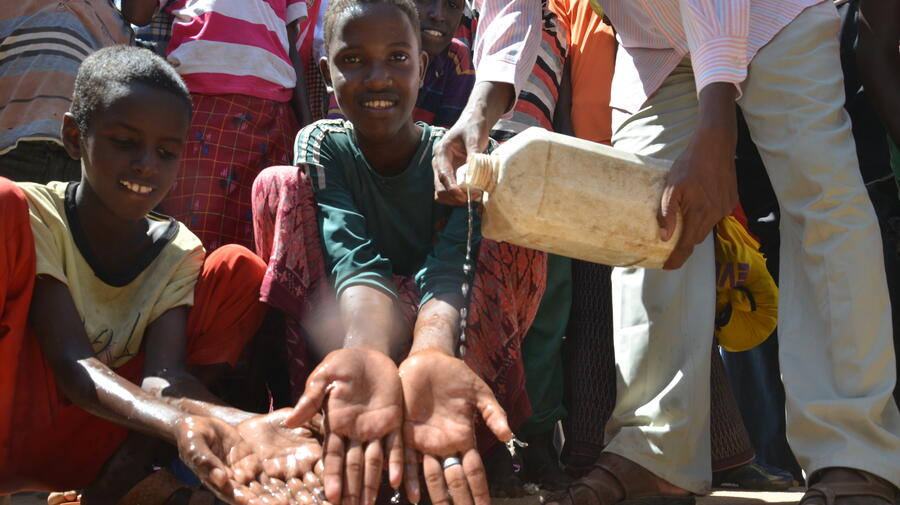 Abdulsalam, 12 and Faisal, 15 from Somalia washing their hands with soap as they take part in a hand washing campaign in Dadaab as part of the response to the current Cholera outbreak.