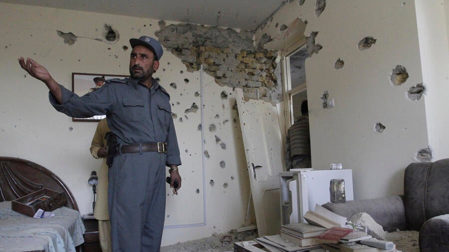 A police officer earlier today inspects damage to the UNHCR office in Kandahar.