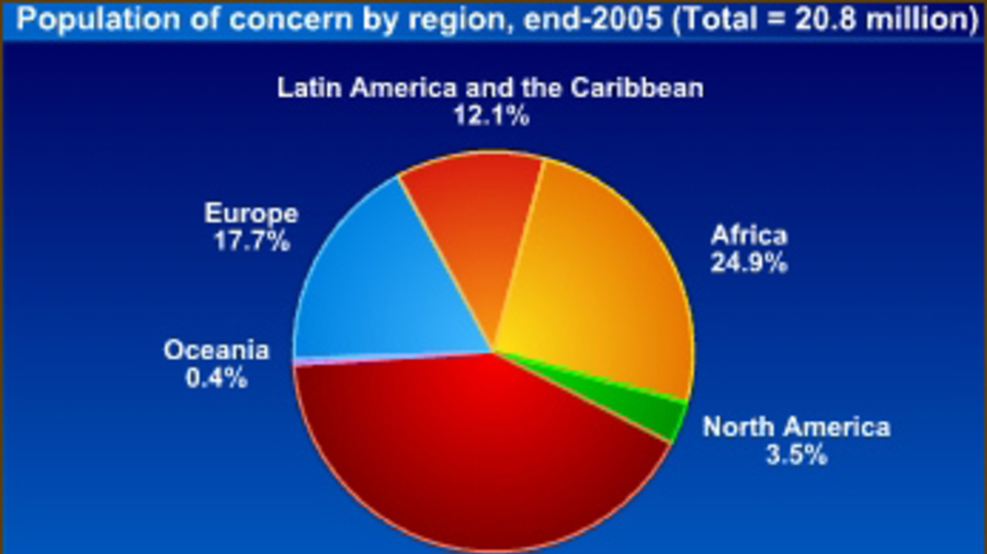 The annual report said that while the number of refugees dropped from 9.5 million in 2004 to 8.4 million last year, the overall number of concern to the agency increased by 1.3 million - from 19.5 million to 20.8 million. Much of the increase is due to a rise in the number of people living in refugee-like situations within their own countries. UNHCR now counts 6.6 million conflict-generated internally displaced people in 16 countries as being "of concern," compared to 5.4 million in 13 countries at the end of 2004.