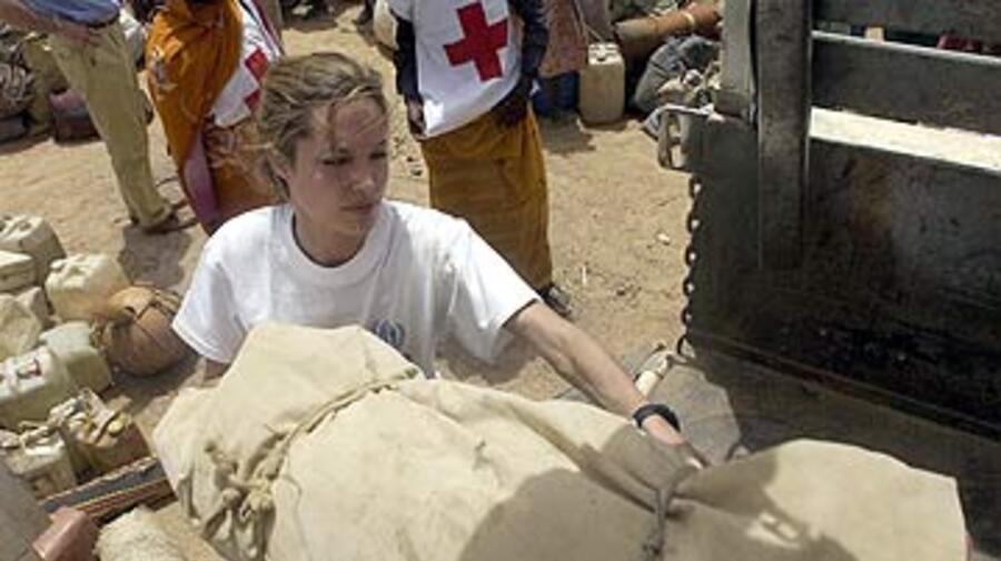 UNHCR Goodwill Ambassador Angelina Jolie helps refugees load their few belongings onto a truck near Tine, Chad, for transport to the safety of UNHCR camps away from the Chad-Sudan border region. These are the most recent refugees to make the treacherous journey across the scorching desert.