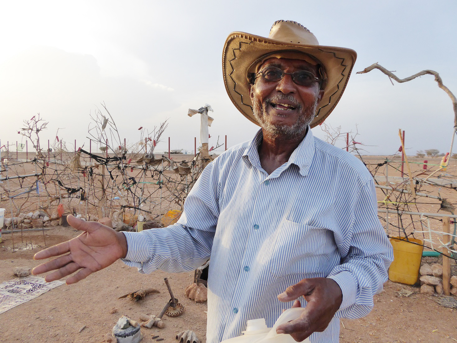 Avid walker and collector, Abdillahi Bashraheel shows off his curios at Markazi Camp in Djibouti.