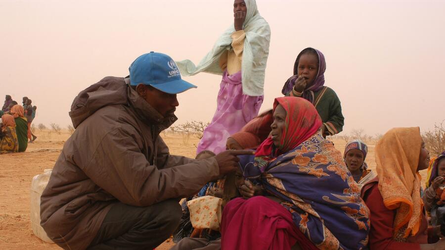 A UNHCR staff member helps a newly arrived Sudanese refugee woman at Touloum camp, near the Chadian border town of Tine.