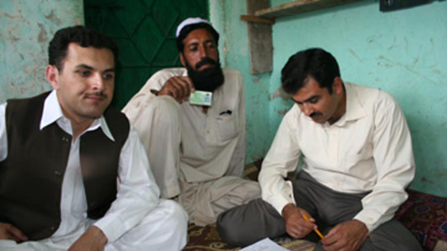 Workers from Sharp, a partner of UNHCR, register an internally displaced man in Pakistan.