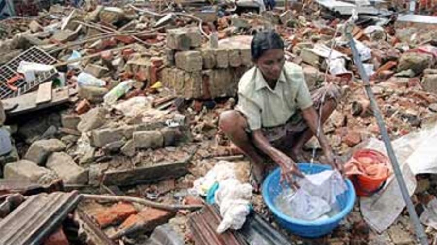 A woman does laundry in the rubble of her home devastated by last week's tidal wave in the southern Sri Lankan city of Galle.