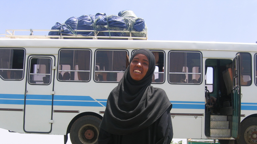 Hodan gets ready to board a bus that will take her to Addis Ababa from Kebribeyah Refugee Camp.