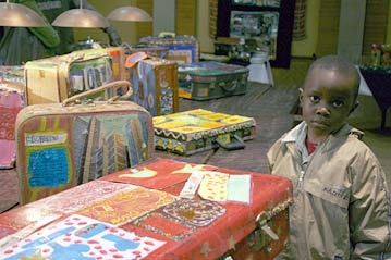 A child amid the painted suitcases that were produced in an art therapy project for refugee children in South Africa. The cases are pictured in a new book in which the children tell of their lives in words and pictures.
