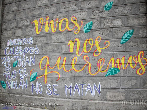Messages written by women survivors of sexual and gender-based violence are displayed in artwork on the walls of the Cotopaxi Reception House – a safe house for refugee and Ecuadorian women in the city of Salcedo, Ecuador.