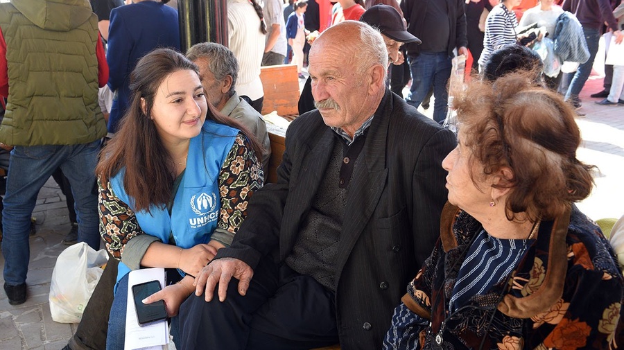 UNHCR employee with refugees in Goris, Armenia. September 2023