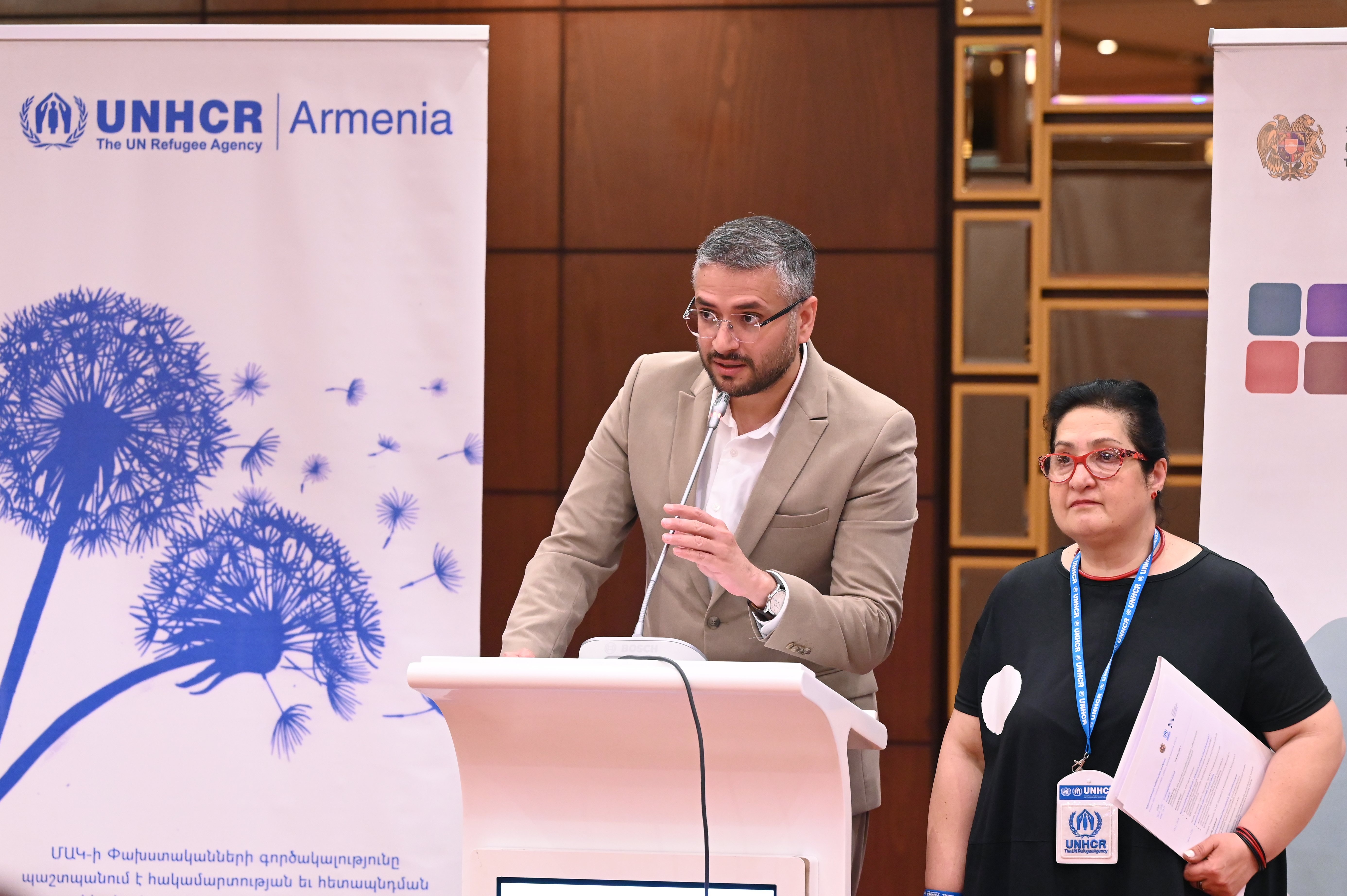 ՄԱԿ-ի Փախստականների հարցերով գերագույն հանձնակատարի գրասենյակի արտաքին կապերի պատասխանատու պարոն Կիրի Ատրին ողջունեց մասնակիցներին՝ խորին երախտագիտությամբ մեր հարգարժան համակազմակերպիչների՝ Միասնական սոցիալական ծառայության (ՄՍԾ) և Միգրացիայի և քաղաքացիության ծառայության (ՄՔԾ) նկատմամբ: Նա գովաբանեց Հայաստանի կառավարությանը փախստականների պաշտպանության հարցում իր անսասան նվիրվածության համար՝ ընդգծելով այսօրվա հավաքի կարևորագույն նշանակությունը: Պարոն Ատրին ընդգծեց ՄՍԾ մասնագետների դերը որպես առաջնագծի պաշտպաններ, որոնք փախստականներին հնարավորություն են տալիս վերականգնել իրենց կյանքը կայուն կենսապահովման հնարավորությունների միջոցով: Նա նաև գովաբանեց Հայաստանի մասնավոր հատվածին փախստականներին համայնքում ինտեգրելու գործում ցուցաբերած կարևոր աջակցության համար՝ նշանավորելով ավելի ներառական և կարեկից հասարակության ստեղծմանն ուղղված համատեղ ջանքերը: