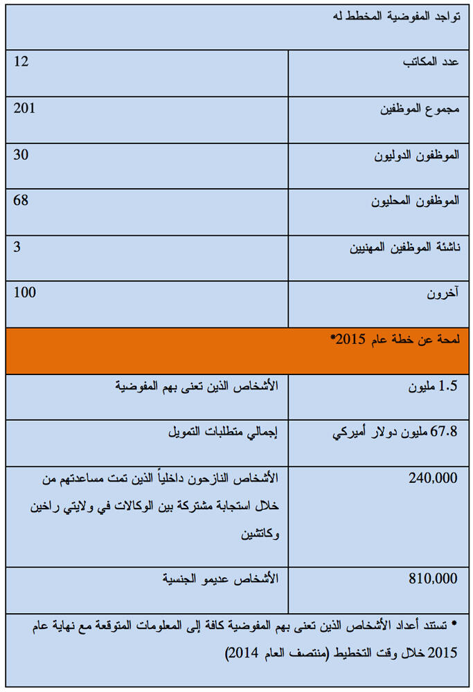يعرض الجدول التالي أمثلة عن بعض الأنشطة الرئيسية المخطط لها لعام 2015. ومن خلال استخدام مجموعة مختارة من الأهداف من خطط برامج المفوضية للعامين 2014-2015، نلاحظ أنه تم تصميم البرامج لتوضيح: