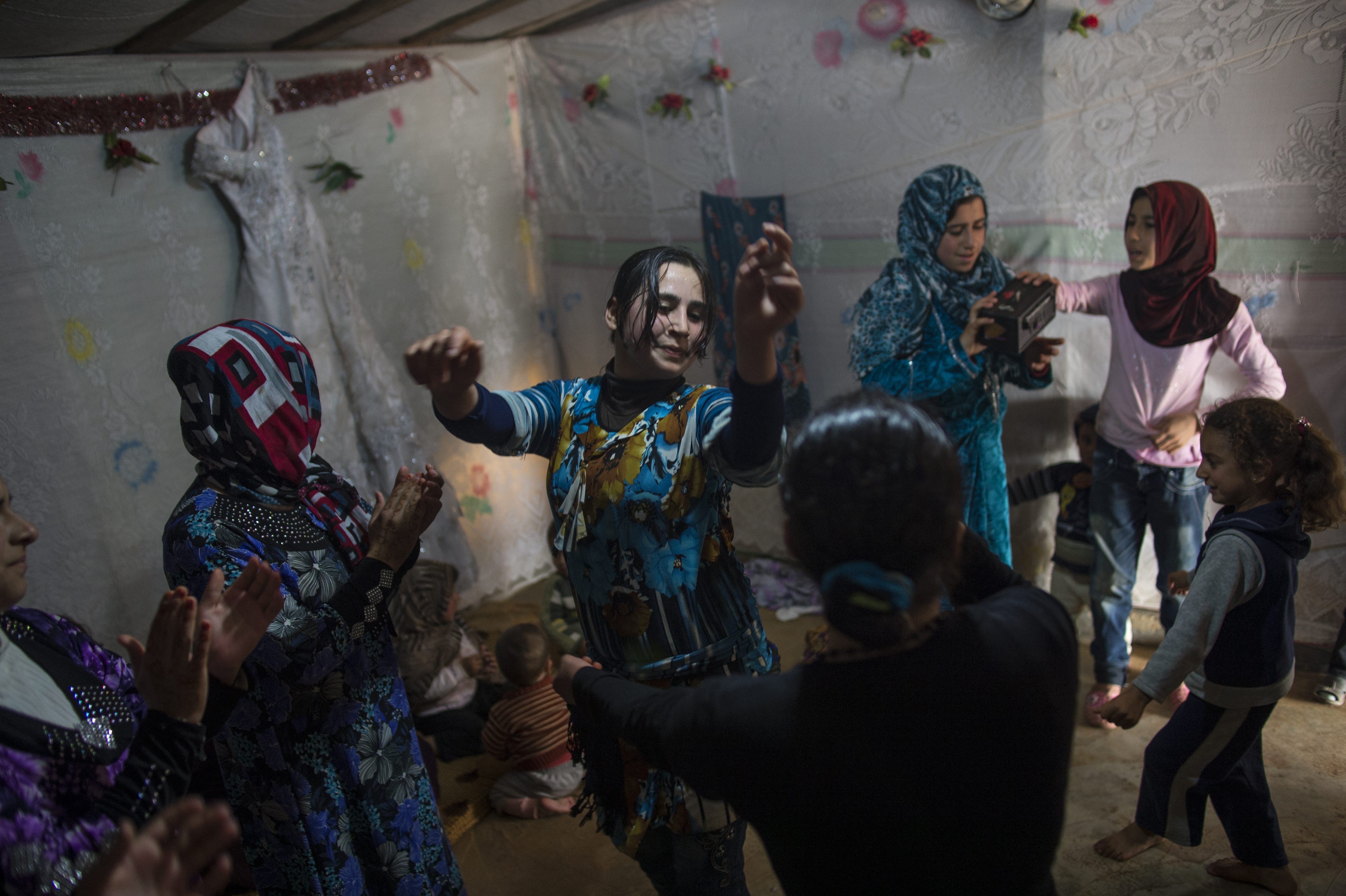 في المخيم المؤقت في مرج الخوخ، في مرجعيون، خيطت الخيم من الأغطية البلاستيكية، والقماش المشمّع ومن لافتات إعلانية قديمة من النايلون في مشهد غير مألوف عند الحدود اللبنانية السورية. تنساب الموسيقى إلى ذاك الموقع الذي يسيطر عليه السكون في العادة، وفي منزل يسرا البالغة من العمر 16 عاماً، فتيات ونساء فرحات يرفعن أيديهن في الهواء ويتمايلن داخل الغرفة احتفالاً بزفاف اليوم. وتجلس نساء أخريات بطمأنينة حاملات أولادهن في أحضانهن؛ جميعهن يضحكن أو يخفين بالوشاح خجلات ابتسامات لا يستطعن كبتها. بعد حوالي سنة من تغطيتي قصص اللاجئين السوريين في تركيا، ولبنان والأردن والعراق وفي مخيمات النازحين في سوريا، شهدت أخيراً على حدث سعيد. ولساعات قليلة، تخيلت كيف كانت حياتهم لتكون لو كانوا في بلادهم. أخيراً، تحرّروا من سنوات الأذى التي سببتها الحرب، ومن الصعوبات التي واجهوها كونهم لاجئين. وفي وقت سابق هذا الصباح، تحدّث والد العريس عن الزفاف وقال: "نريد أن نوجد الحياة من الموت، ومن الحزن نريد أن نوجد السعادة."