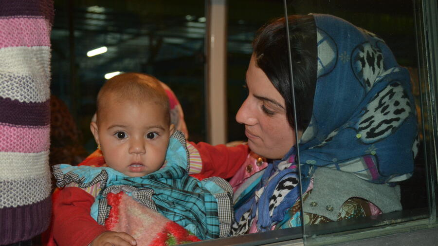 مخيم قوشتبة للاجئين، العراق، 29 أكتوبر/تشرين الأول (المفوضية السامية للأمم المتحدة لشؤون اللاجئين) - ترعى طريفة أفراد عائلتها الجياع والمتعبين لدى وصولهم في حافلة صغيرة إلى مخيم اللاجئين هذا في شمال العراق بعد أكثر من أسبوعين على فرارهم من ديارهم في مدينة عين العرب (كوباني) السورية.