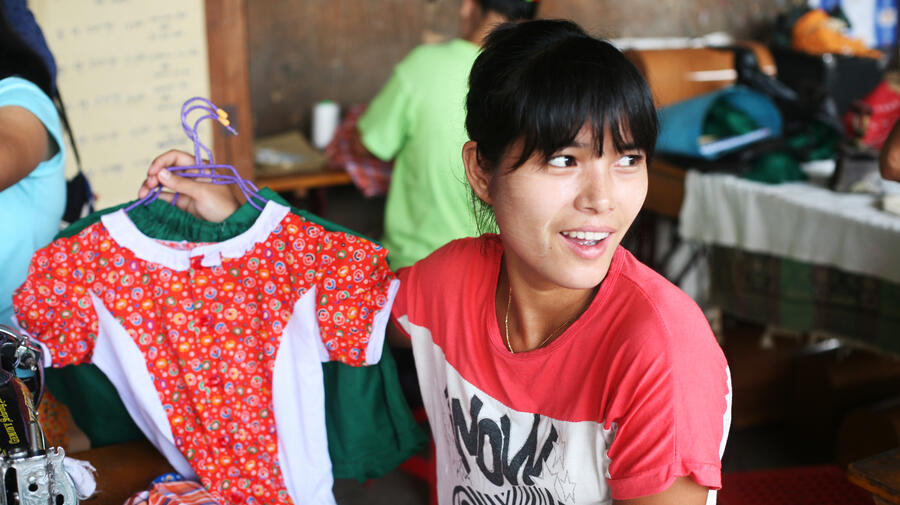 لايزا، ميانمار، 29 أكتوبر/تشرين الأول (المفوضية السامية للأمم المتحدة لشؤون اللاجئين) - بين الأقمشة الملوّنة الموزعة حول الطاولات، وعلى إيقاع صوت آلات الخياطة الذي تقاطعه الضحكات والأحاديث، تربط مودة كبيرة مجموعة من النساء في أحد مخيمات النازحين داخلياً في لايزا. ولكن هؤلاء الطالبات الصامدات فقدنَ جميعهنّ منازلهنّ وكلّ ما يملكن.