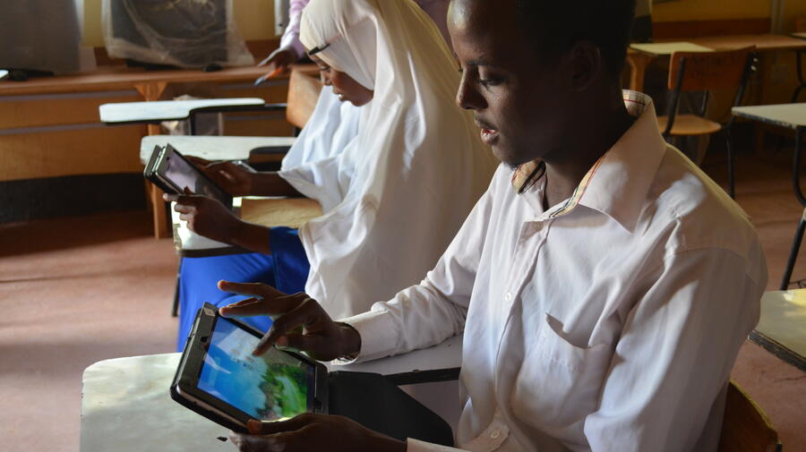داداب، كينيا، 4 فبراير/شباط (المفوضية السامية للأمم المتحدة لشؤون اللاجئين) - تتوجه ثلاثون زوجاً من العيون إلى الشاشة البيضاء الكبيرة وتنساب الأصابع على شاشات الحواسيب اللوحية الجديدة. إنهم تلاميذ أحد صفوف مدرسة نسيب الثانوية في مخيم داداب للاجئين في شمال شرق كينيا، يستمتعون بدرس في مادّة التاريخ عن البرتغاليين في إفريقيا.