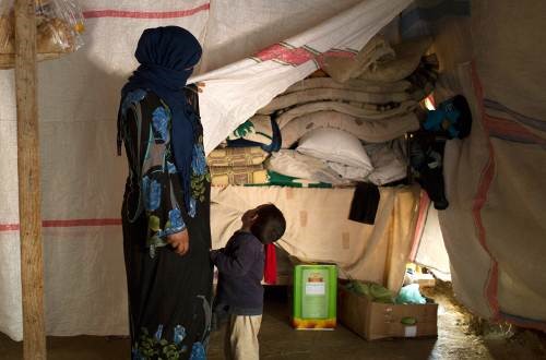 جنان وهي تهمّ بدخول الخيمة التي تسكنها مع عائلتها في مخيم عشوائي في شمال لبنان، في حين يلعب طفلها شاهر (2) بزجاجة ماء تحت أنظار ابنة أخيها. غادرت جنان حمص منذ عامين مع زوجها غازي، وذلك بعد مرور بضعة أشهر فقط على زواجهما. كانت جنان حاملاً بشاهر عندما فرّ الزوجان من بلدتهما، تاركين كل شيء خلفهما، بحثاً عن الأمان في لبنان.